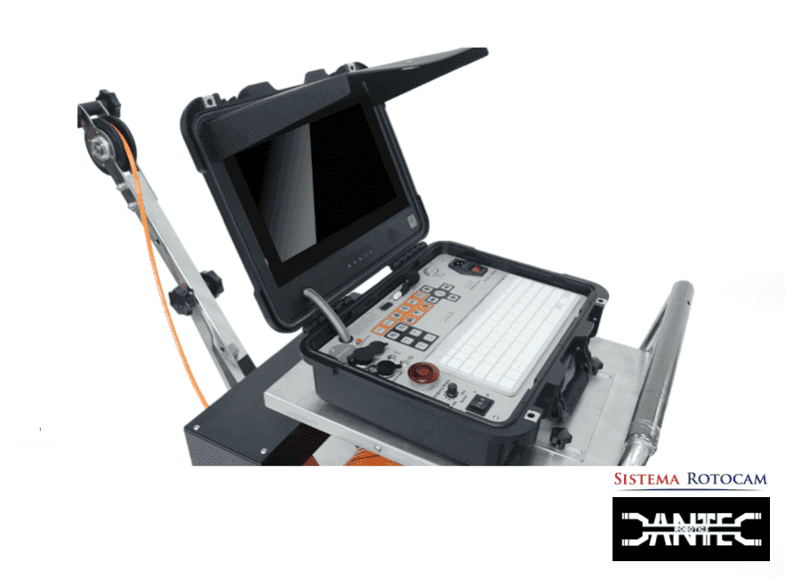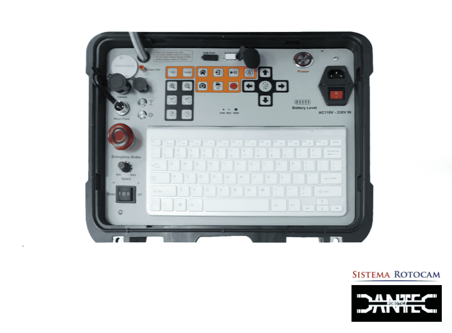 Los conectores presentes permiten la conexión con el carrete de cable motorizado, y el botón de emergencia garantiza la seguridad durante las operaciones. Esta unidad de control representa una solución completa y profesional para el monitoreo y la gestión de inspecciones con el SISTEMA ROTOCAM MOTORIZADO.